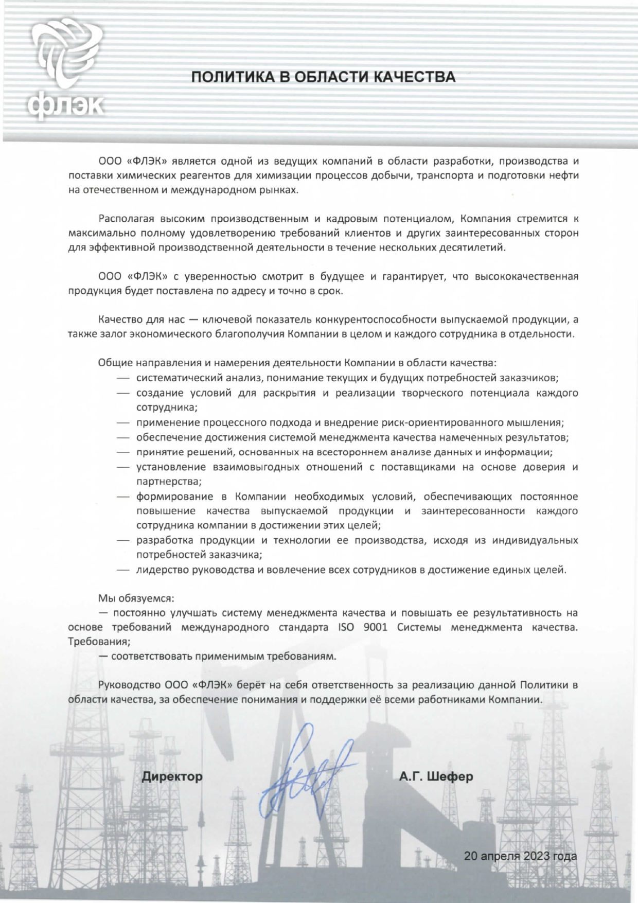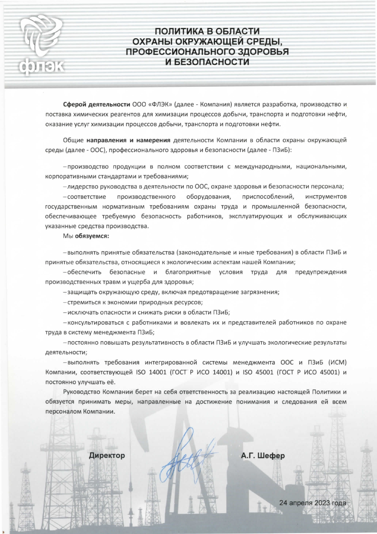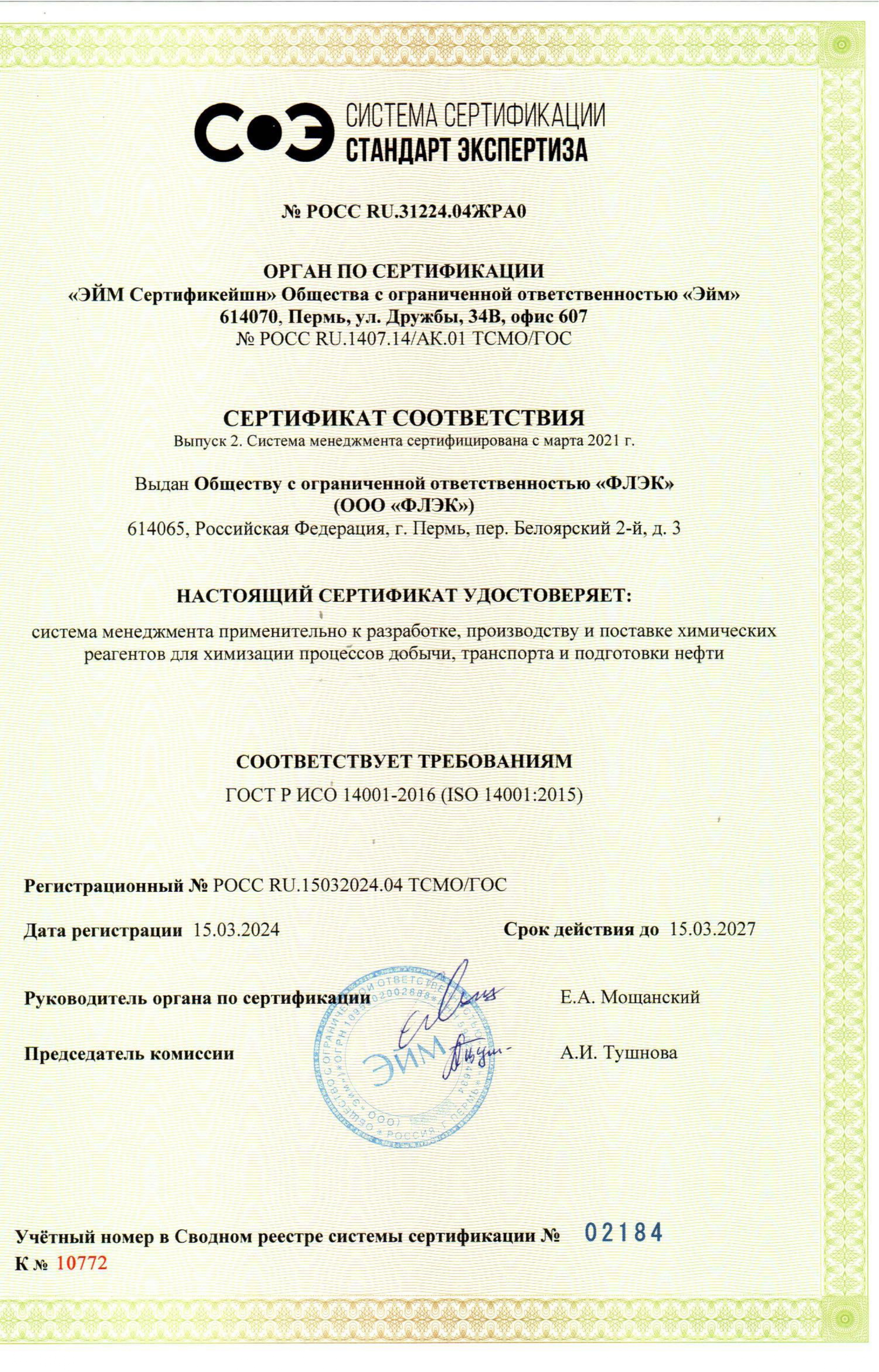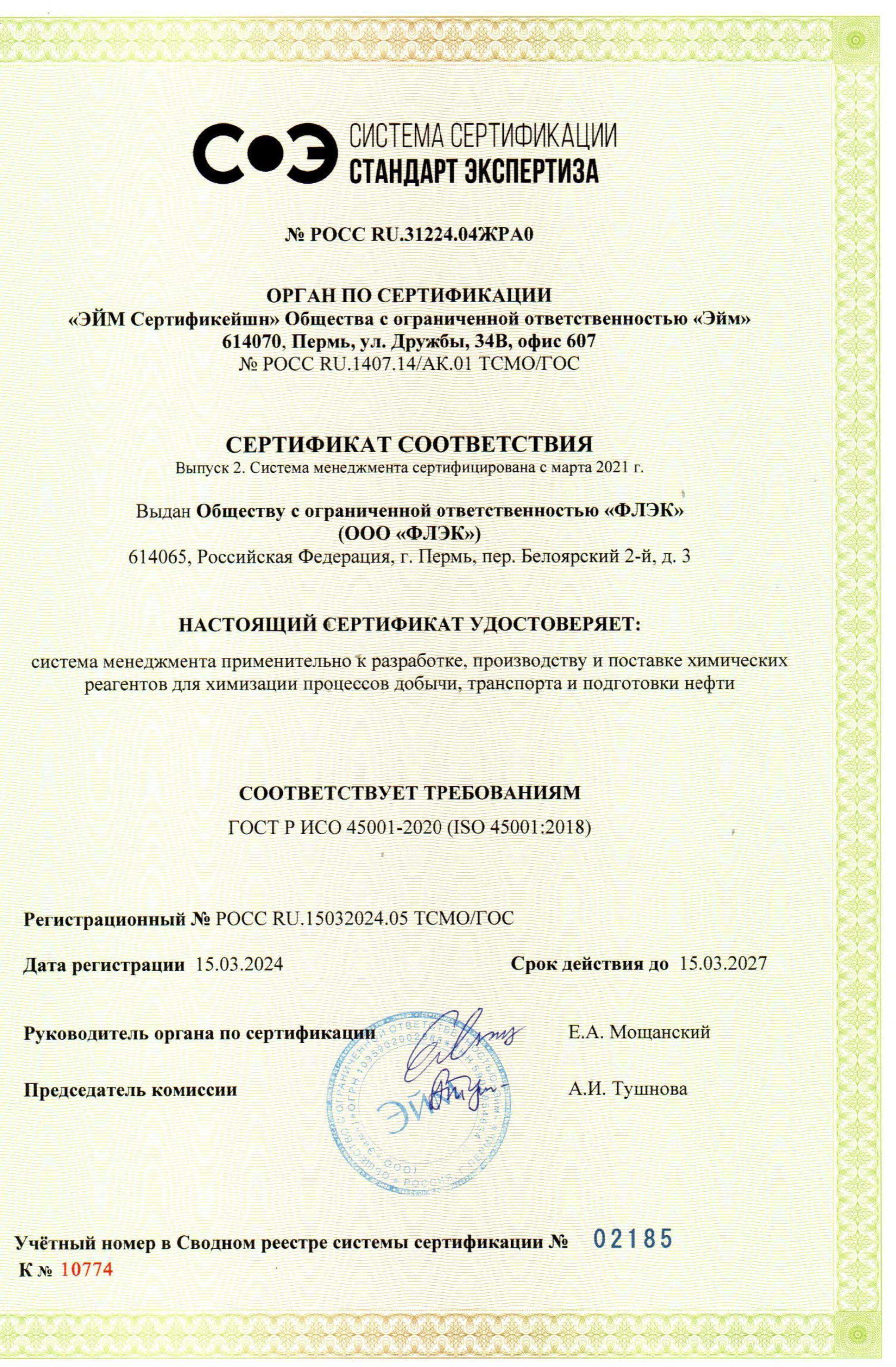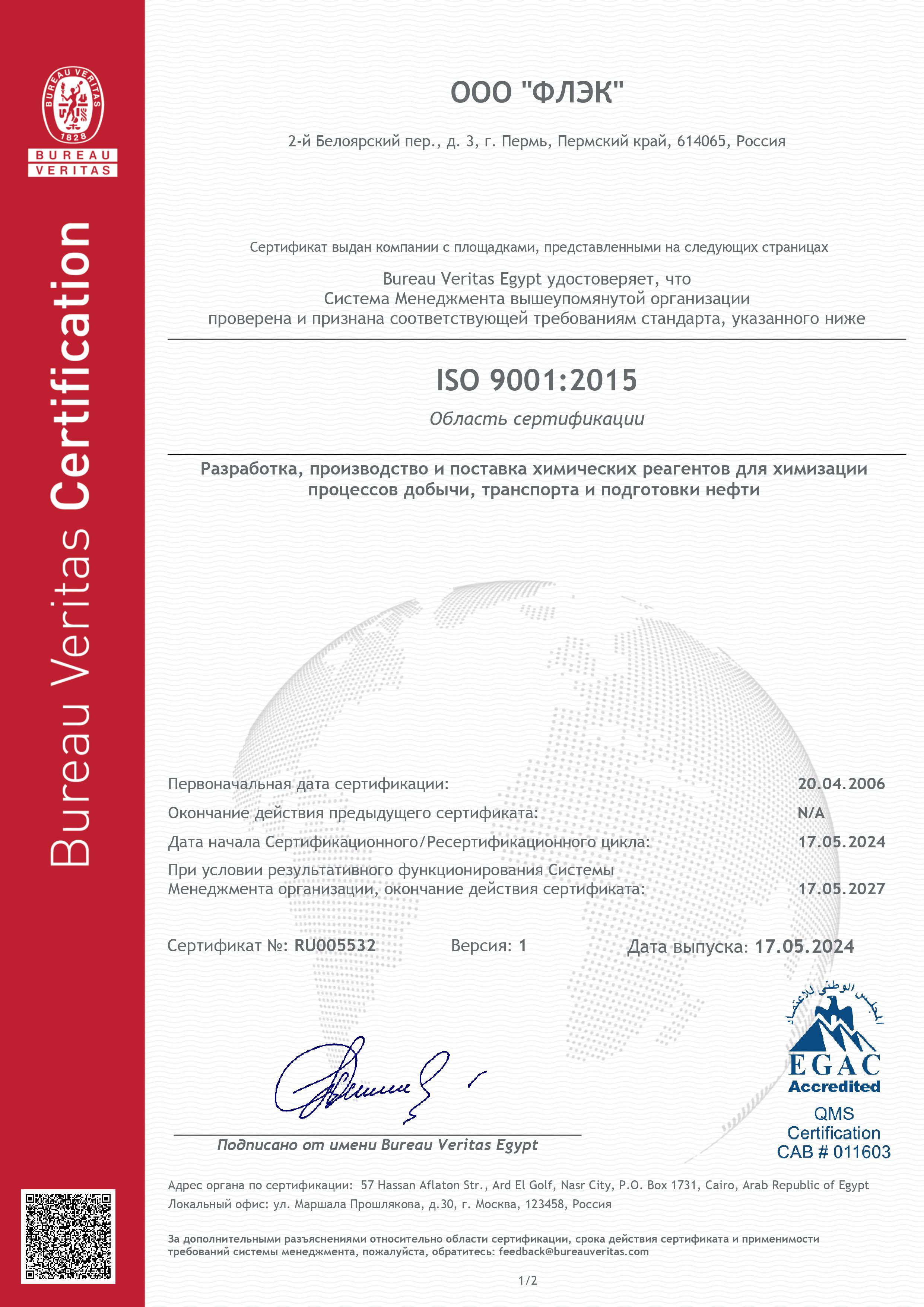 В 2024 году в компании была проведена ре-сертификация систем менеджмента на соответствие стандартам ISO 9001:2015, ISO 14001:2015 и ISO 45001:2018 в области «Разработка, производство и поставка химических реагентов для химизации процессов добычи, транспорта и подготовки нефти».